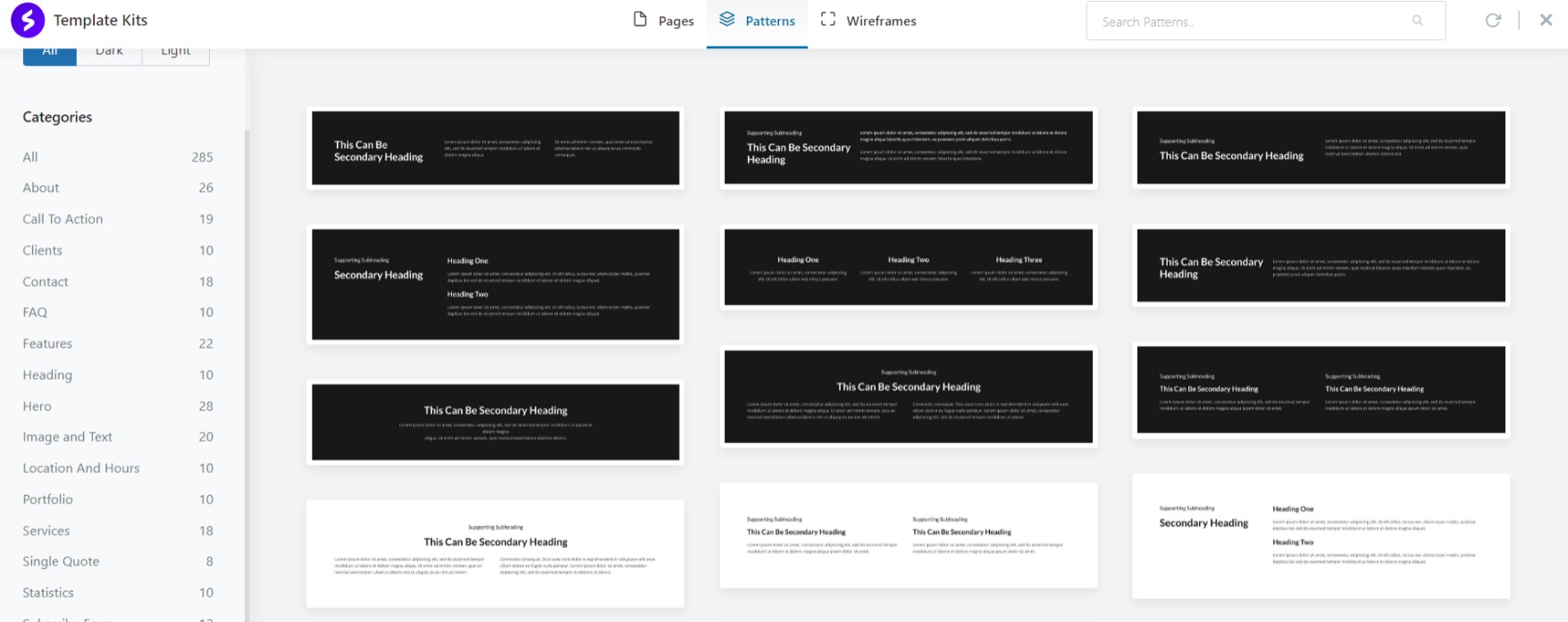 Jedną z zalet wtyczki, której warto się przyjrzeć jest funkcja „Wireframes” – w odróżnieniu od gotowych elementów (ze zdjęciem i opisami) importowanych na jedno kliknięcie, tutaj dodawany jest szkielet sekcji bez dodatkowej treści. Dzięki temu masz większy wpływ na wygląd swojej strony i możesz podejść do edycji w bardziej kreatywny sposób.