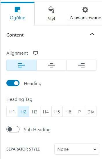 - Ogólne – podstawowe opcje związane z formatowaniem wyglądu bloku tj. ustawienie treści czy konfiguracja SEO